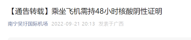 9月10日至10月31日南宁乘坐飞机需持48小时核酸证明