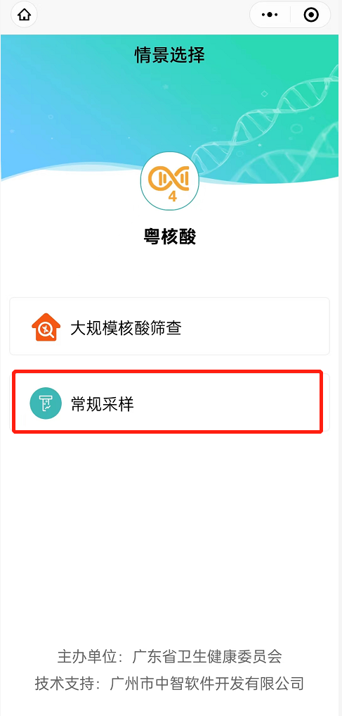 1、进入粤核酸小程序,选择“常规采样”