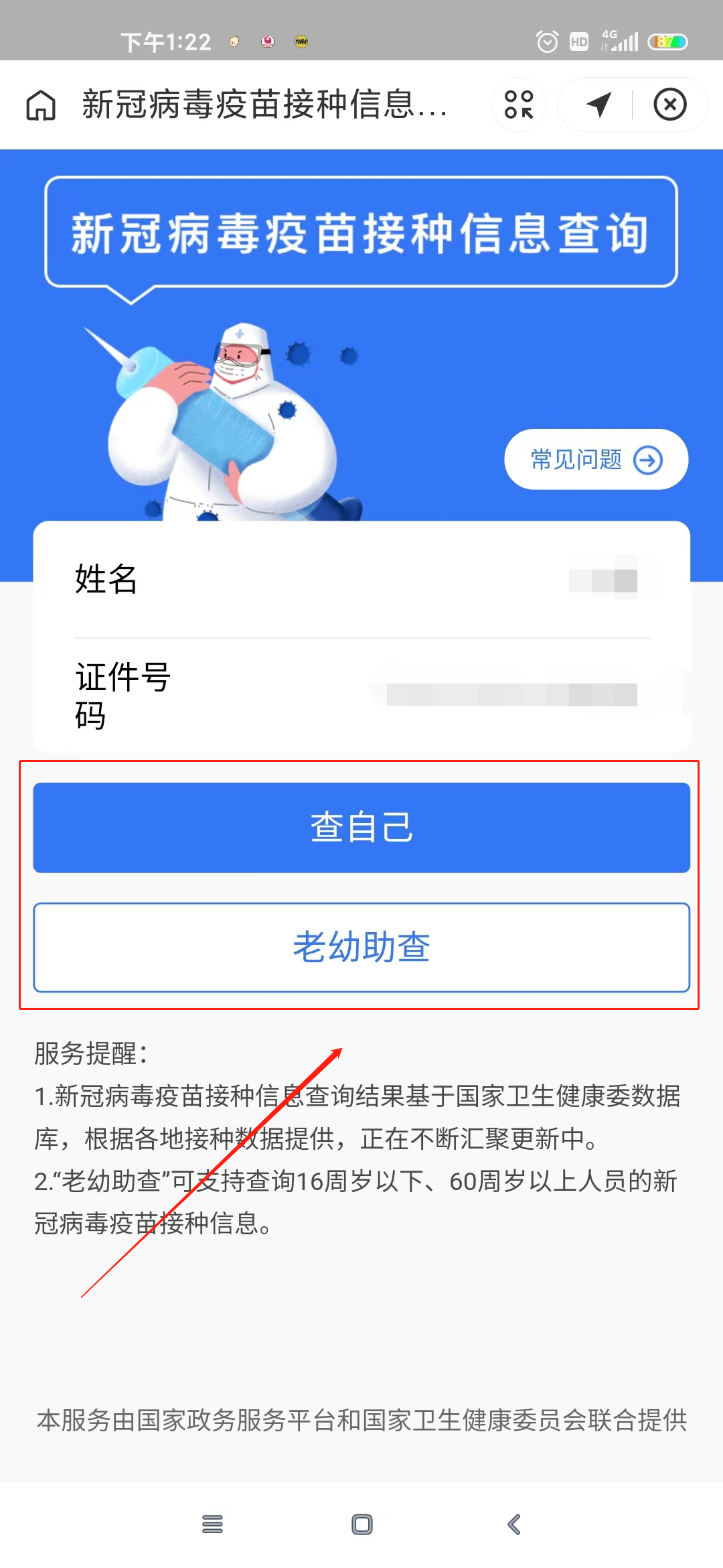 3、选择【查自己】或【老有助查】。