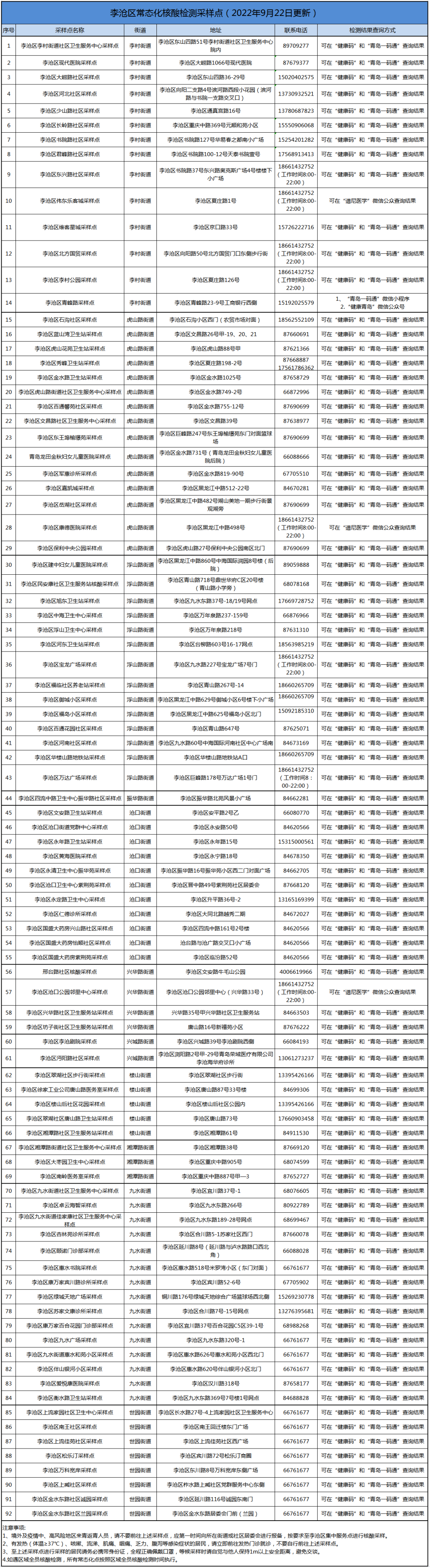 全员核酸检测采样点详情见本通告下方或扫码“李沧全民核酸检测点”小程序进行查询。