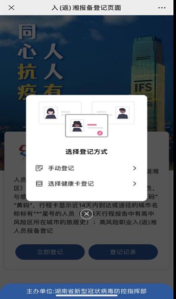 3、提示两种方式均可进行登录,有“湖南省居民健康卡”的居民选择“健康卡登记”;如没有,选择手动登记;