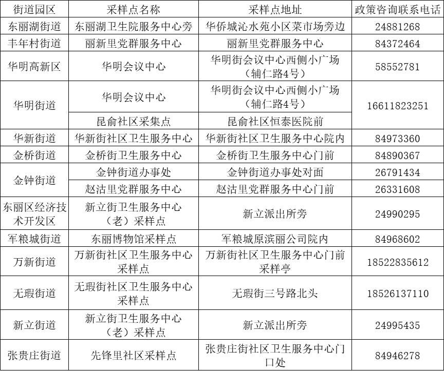 为保障全体居民在本轮核酸筛查期间应筛尽筛,进一步方便群众进行核酸补检,东丽区各街道园区设置了核酸补检采样点(具体点位附后),对未参加9月23日全域核酸筛查人员进行补检,确保全覆盖、无遗漏。