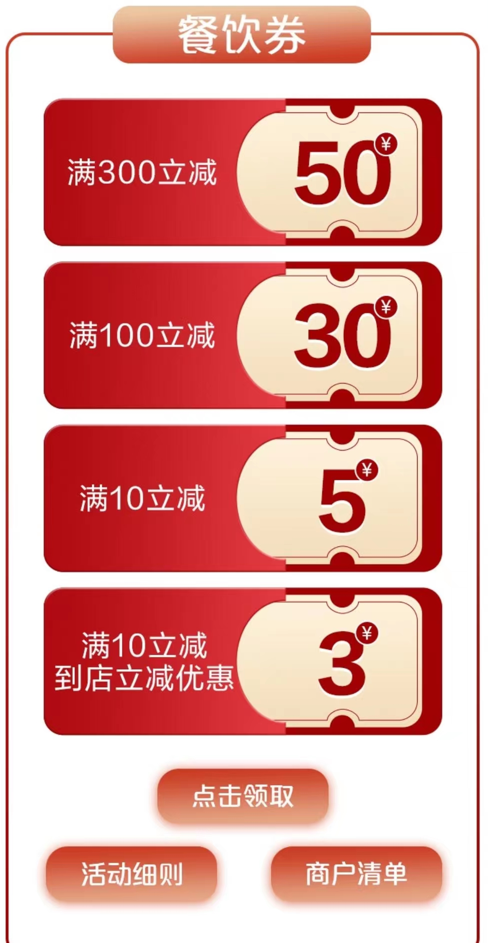 50元,30元,5元及3元餐饮券,单人每3天每种面值限领2张,单人单周每种面值限领2张。消费券数量有限,先到先得,领完为止。