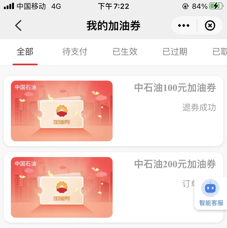 中国石油电子加油券购买成功后,可点击活动页面“查看已购加油券”查看我的加油券,点击“去使用”将生成中石油加油码并可在中石油指定加油站加油,点击“退券”可申请退券(有效期内退券可自主在平台申请退券,;票券超过有效期后,相关问题用户可点击智能客服或拨打下方客服热线咨询。)。