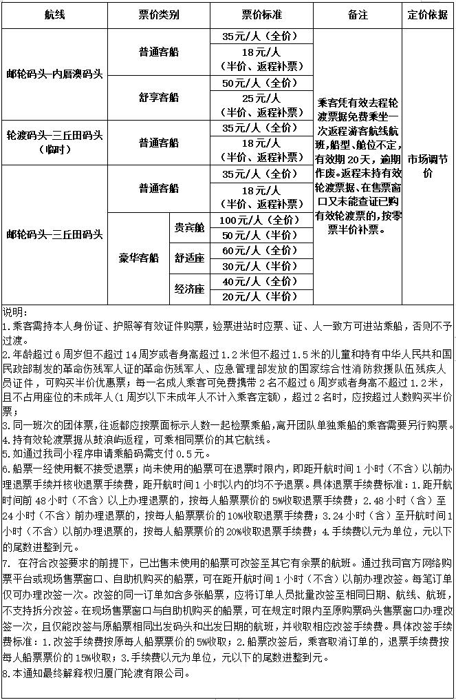 根据《福建省人民政府关于印发福建省定价目录的通知》(闽政〔2022〕14号),厦鼓旅游客运航线实行市场调节价。经研究,我司现有旅游客运航线的票价仍保持现行票价,具体详见附表,于2022年9月16日起执行。
