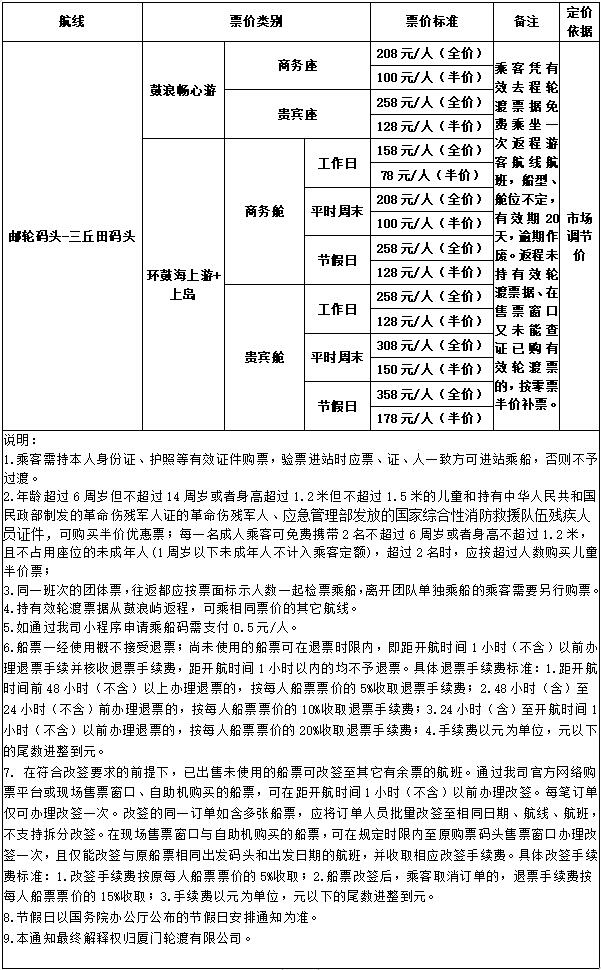 根据《福建省人民政府关于印发福建省定价目录的通知》(闽政〔2022〕14号),厦鼓旅游客运航线实行市场调节价。为顺应鼓浪屿申遗后精品旅游的发展趋势,挖掘鼓浪屿旅游价值,满足不同乘客多层次游览需求,我司推出了一系列甄选航线。相关航线票价具体详见附表,于2022年9月16日起执行。