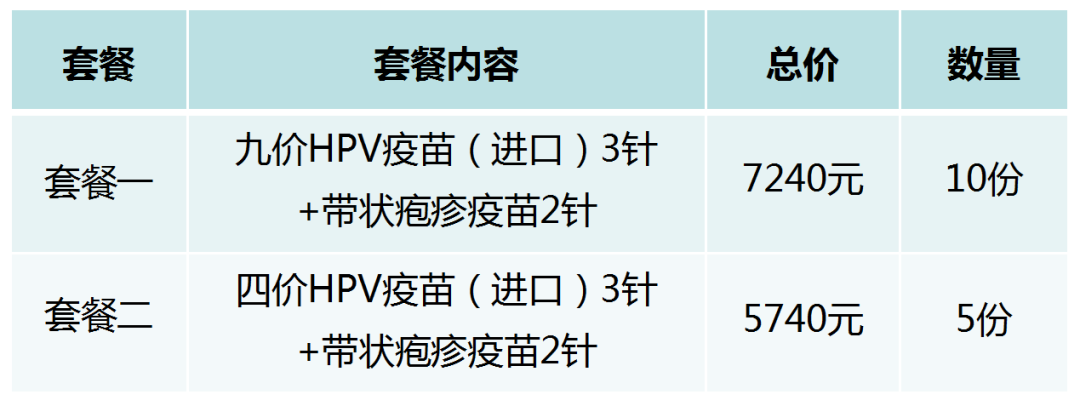 注:九价HPV疫苗、四价HPV疫苗都共需接种3针,带状疱疹疫苗共需接种2针,套餐内费用为一次性收取。