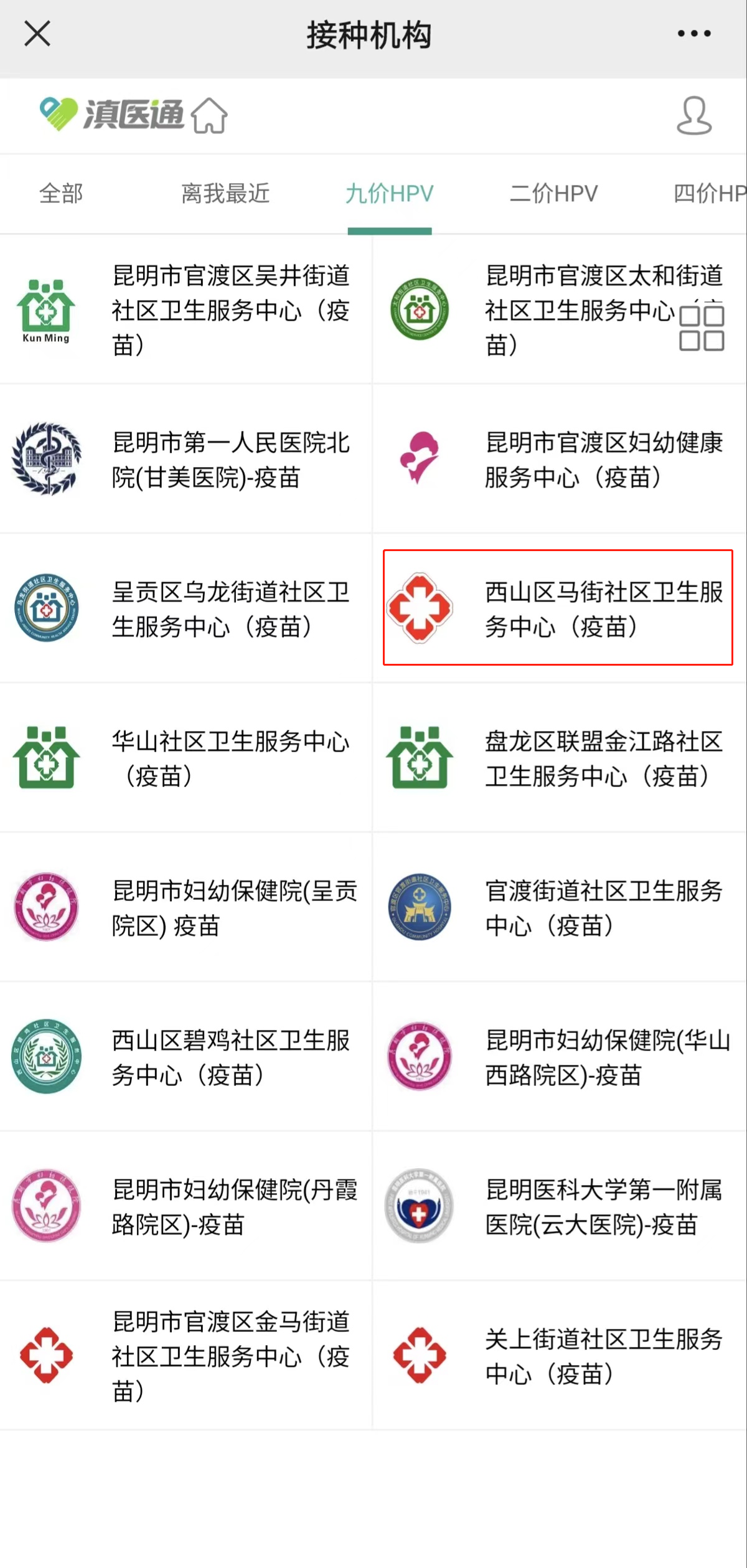 第四步:找到西山区马街社区卫生服务中心,点击后即可预约。