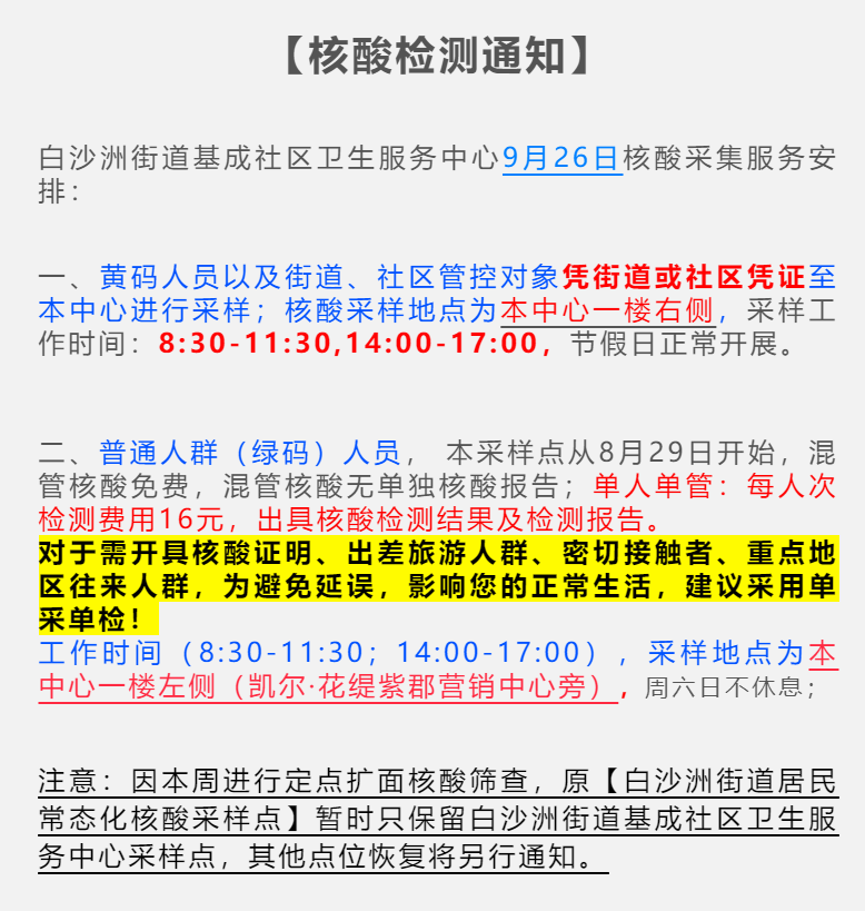 注意:因本周进行定点扩面核酸筛查,原【白沙洲街道居民常态化核酸采样点】暂时只保留白沙洲街道基成社区卫生服务中心采样点,其他点位恢复将另行通知。