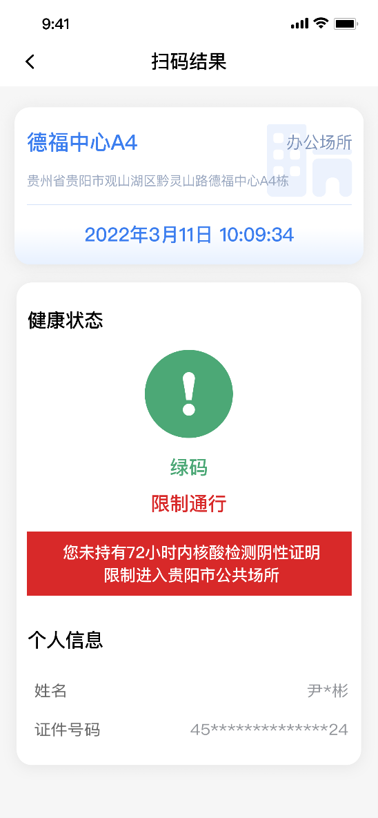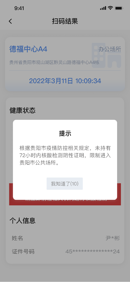 该场所码弹窗提示:根据贵阳市疫情防控相关规定,未持有72小时内核酸检测阴性证明,限制进入贵阳市公共场所。该类人员属于贵阳市规定需“三天一检”人员,无72小时内核酸检测阴性证明,不能进入贵阳市公共场所。