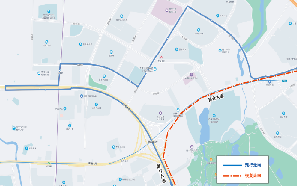 经现场踏勘,邕宾立交桥匝道引桥和公交站点已建成投入使用,具备公交车安全通行和停靠的条件,经研究决定,南宁邕城公交公司从2022年9月27日起恢复20路行驶昆仑大道(降桥路至虹桥路)以及38路、43路和75路恢复“厢竹南梧立交”西面站点停靠,具体情况如下:
