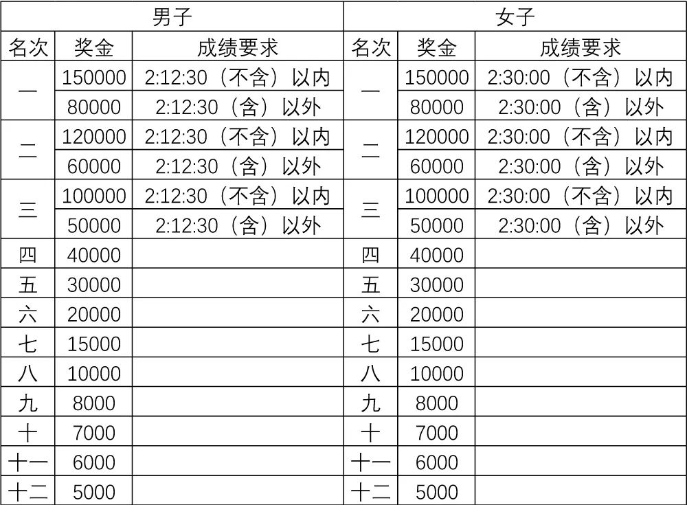 按枪声成绩录取:破厦门马拉松赛(男、女)最好成绩,奖励3万美元。