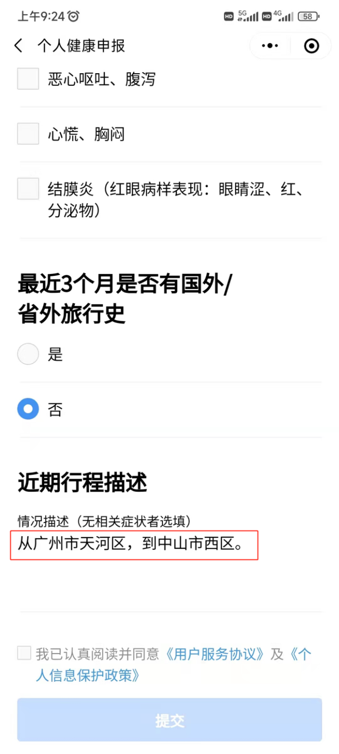 3、填写本人健康情况。注意提醒申报人必须在“近期行程描述”中填写“从XXX市XXX区,到中山市XXX区。”例如:“从广州市天河区,到中山市西区”。