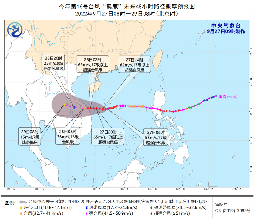 预计,“奥鹿”将以每小时25公里左右的速度继续向偏西方向移动,27日掠过西沙群岛,强度还将有所加强,将于28日早晨到中午在越南东部沿海登陆,登陆后强度快速减弱。
