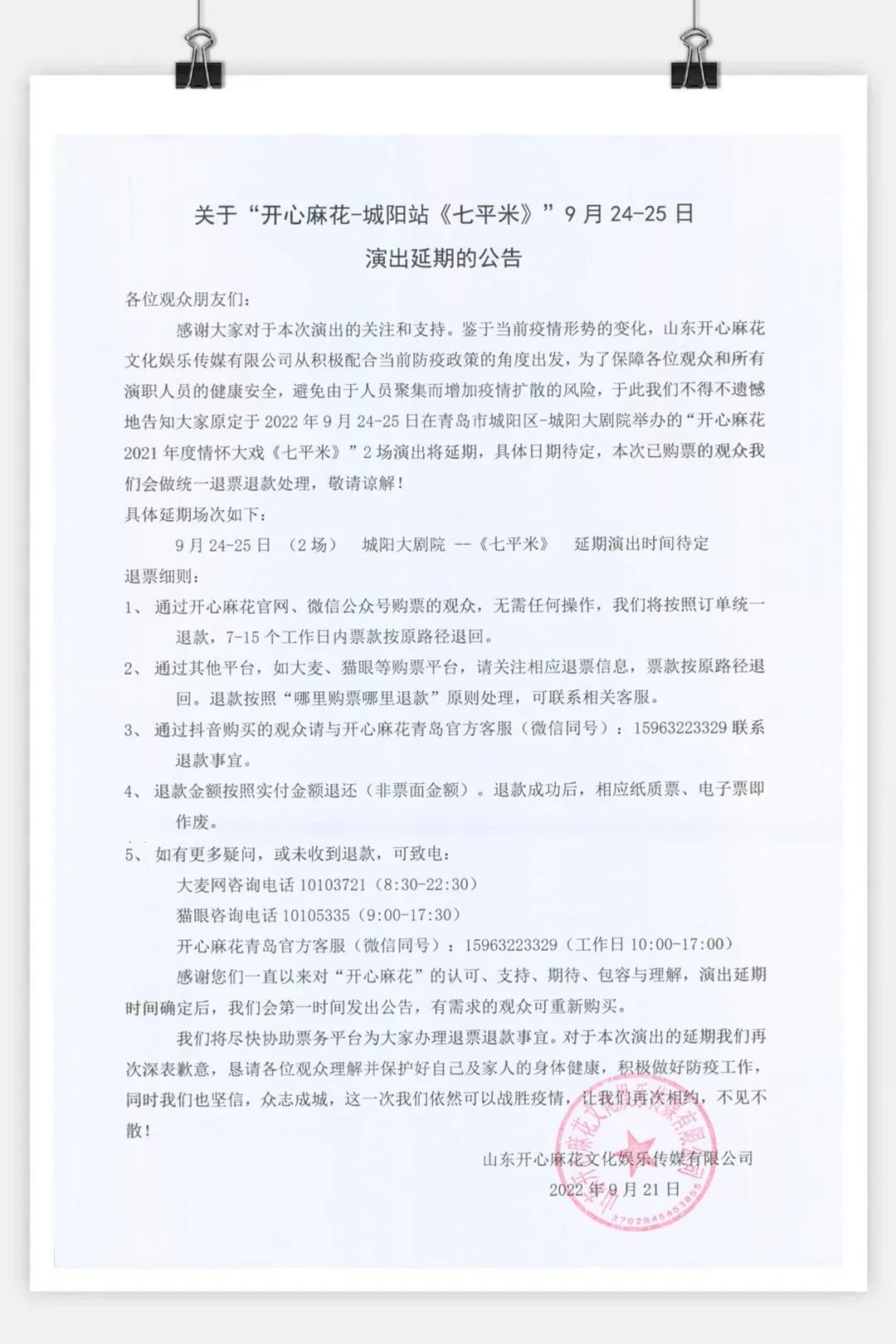 鉴于当前疫情形势变化,为有效配合当地相关部门疫情防控工作,保障观众和所有演职人员的健康安全,避免由于人员聚集而增加疫情扩散的风险,原定于2022年09月24-25日,在城阳大剧院上演的开心麻花情怀大戏《七平米》演出延期举行,具体日期待定。
