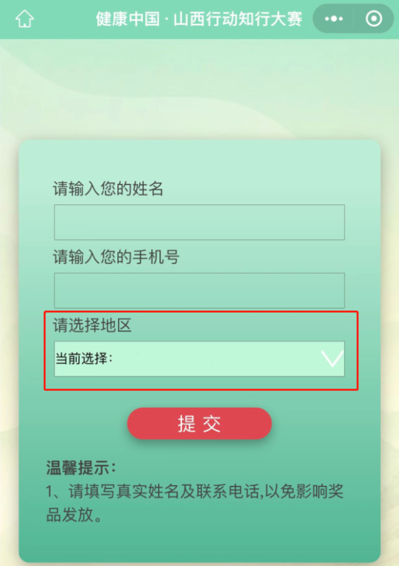 进入答题前需点击登录,授权并完善个人信息,用户选择所属地区精确到县(区)级,提交后不可更改,登陆后显示用户地区。