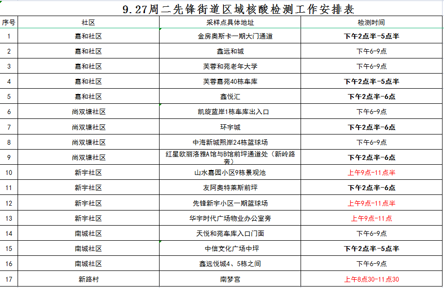 9月27日天心区先锋街道社区卫生服务中心核酸检测安排: