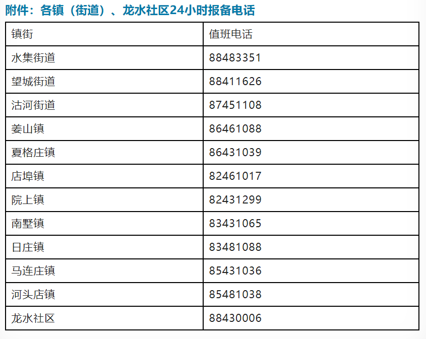 附件:各镇(街道)、龙水社区24小时报备电话