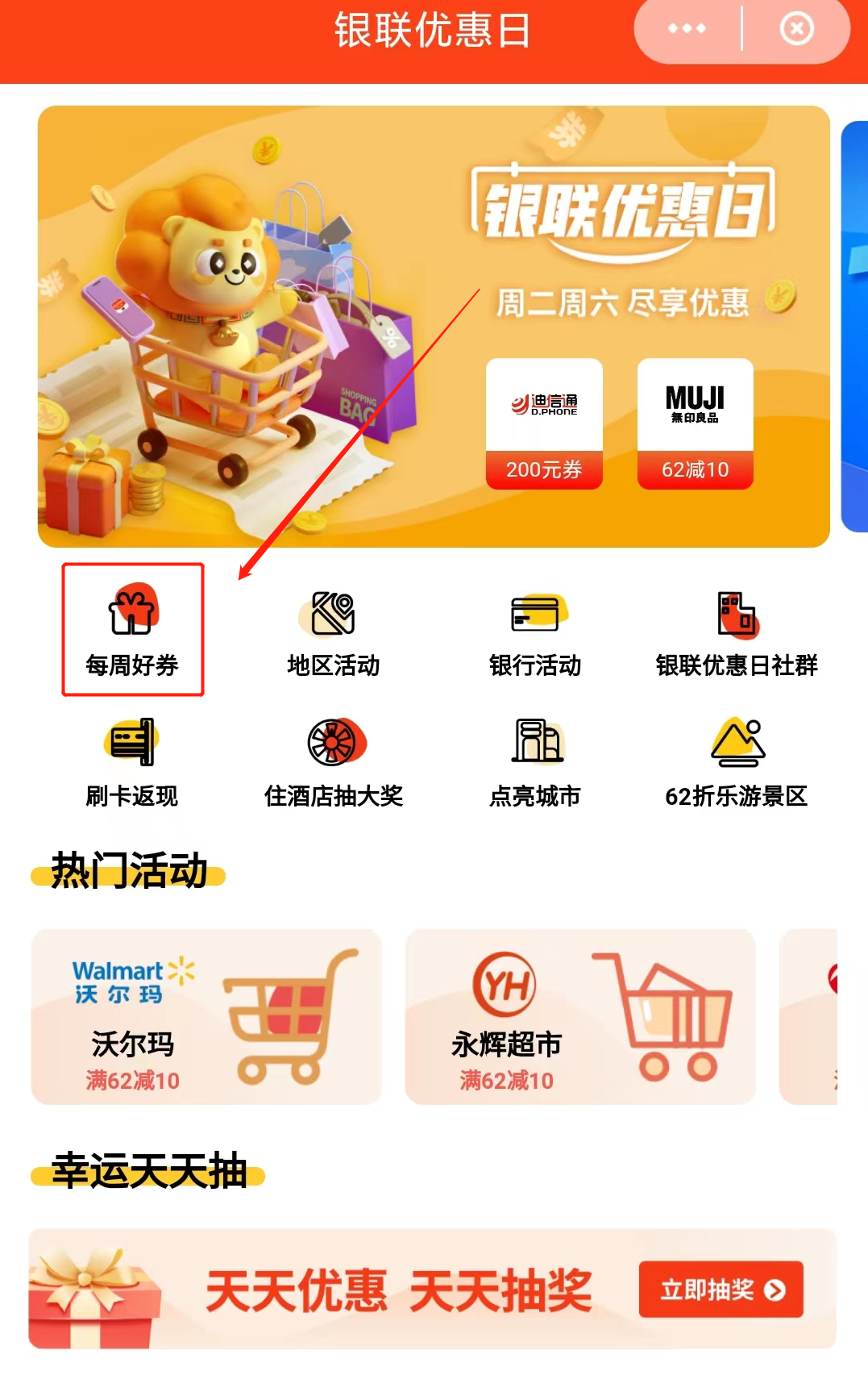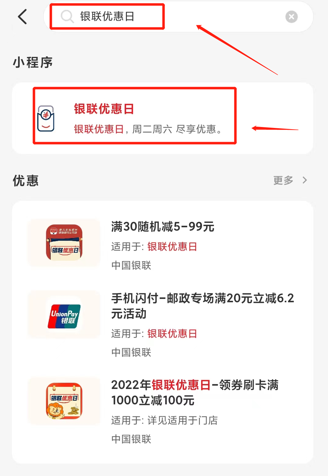 第二步:进入云闪付APP,云闪付APP首页搜索栏搜索“银联优惠日”- 每周好券