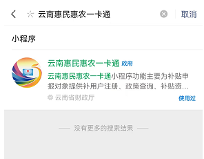 用户打开手机微信客户端,点击上方搜索框,输入“云南惠民惠农一卡通”,点击搜索“云南惠民惠农一卡通”,即搜索列表中找到对应的云南一卡通小程序,点击进入。
