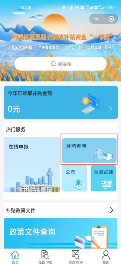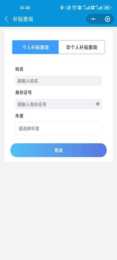 点击首页热门服务下的“补贴查询”,可快速查询自己申报补贴的发放进度。选择【个人补贴查询】,输入补贴对象姓名、身份证号以及年度点击【查询】;选择【非个人补贴查询】,输入对象名称、对象编码及年度点击查询。