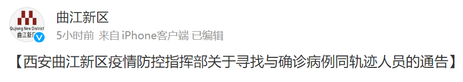 9月27日,接报有确诊病例于9月25日20时至21时10分在曲江新区大唐不夜城步行街区有活动轨迹。