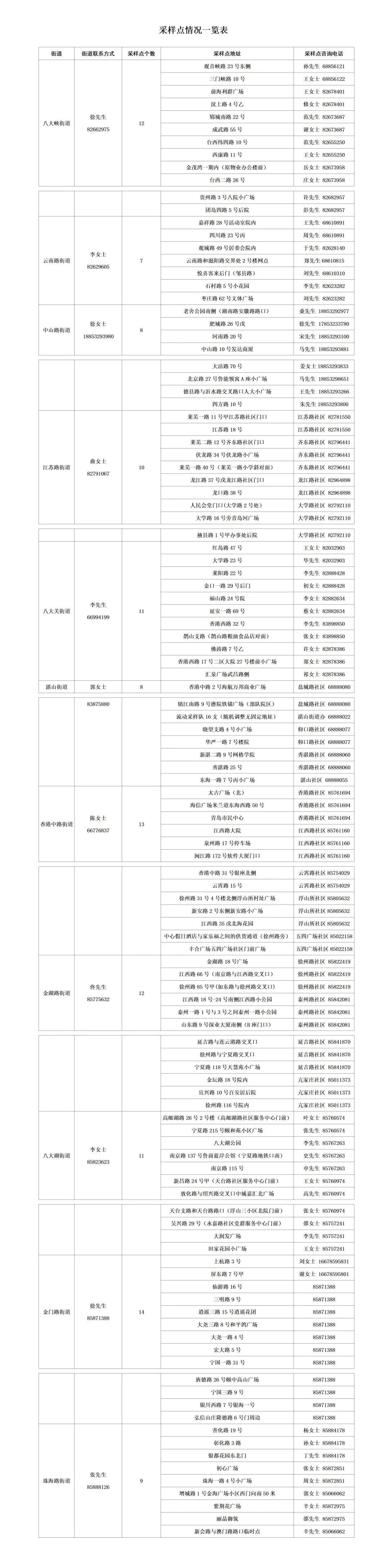 由各街道办事处统一安排采样点,具体信息详见采样点情况一览表(附后),或扫描“市南区核酸检测采样点地图小程序”(附后),对核酸检测采样点进行查询。