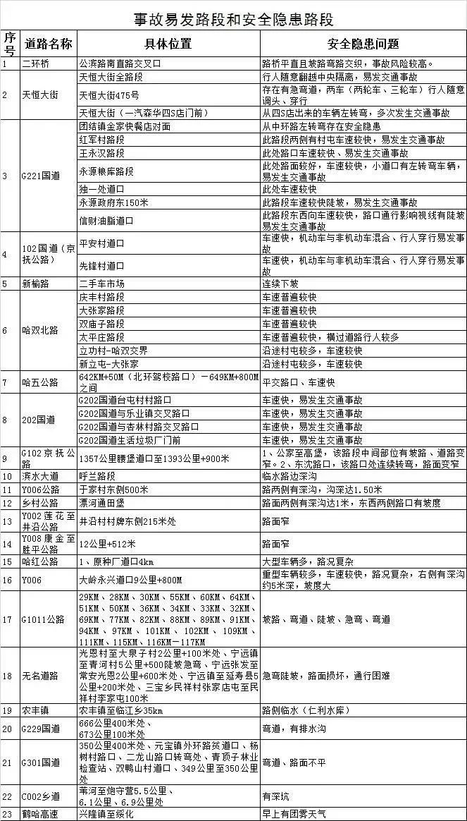 当前,农村地区已进入秋收时节,因此高速公路、国省道、乡镇道路农用车辆相对较多,驾车出行时请注意行车安全。交警部门将加强巡逻管控,重点规范高速公路、国省道各类交通违法行为,严防交通事故、二次事故等情况的发生。同时交警部门经排查后对事故易发路段和安全隐患路段予以公示。