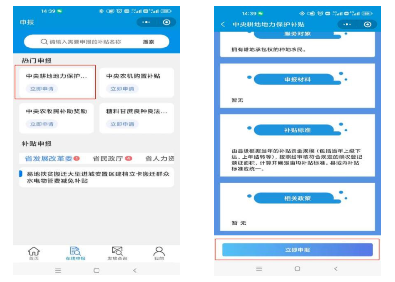 点击小程序首页热门服务下的“在线申报”——立即申报,即可进行相应的申报操作。找到需要申报的补贴项目点击进入申报页面,可在申报须知和流程审批页面点击【立即申报】,可选择【为自己申报】进入补贴申报界面填写相关个人申报信息,填写完成并确认无误后点击【立即申请】进入资料上传界面。