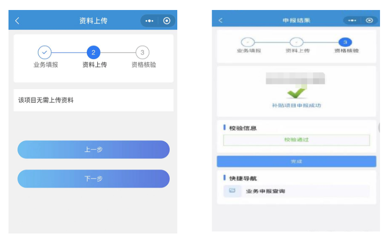 进入【资料上传】页面点击【下一步】,系统会自动校验是否符合申报条件,若提示“补贴项目申报成功”则算申报完成。