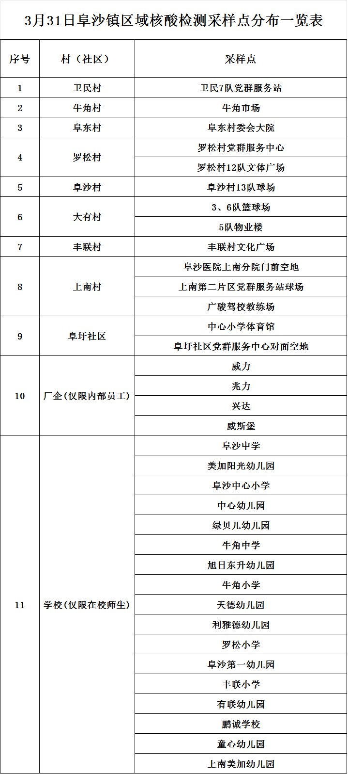 按照市新冠肺炎疫情防控指挥部统一部署,阜沙镇将于3月31日(7:00至13:00)开展区域核酸检测工作。现将有关事项通知如下: