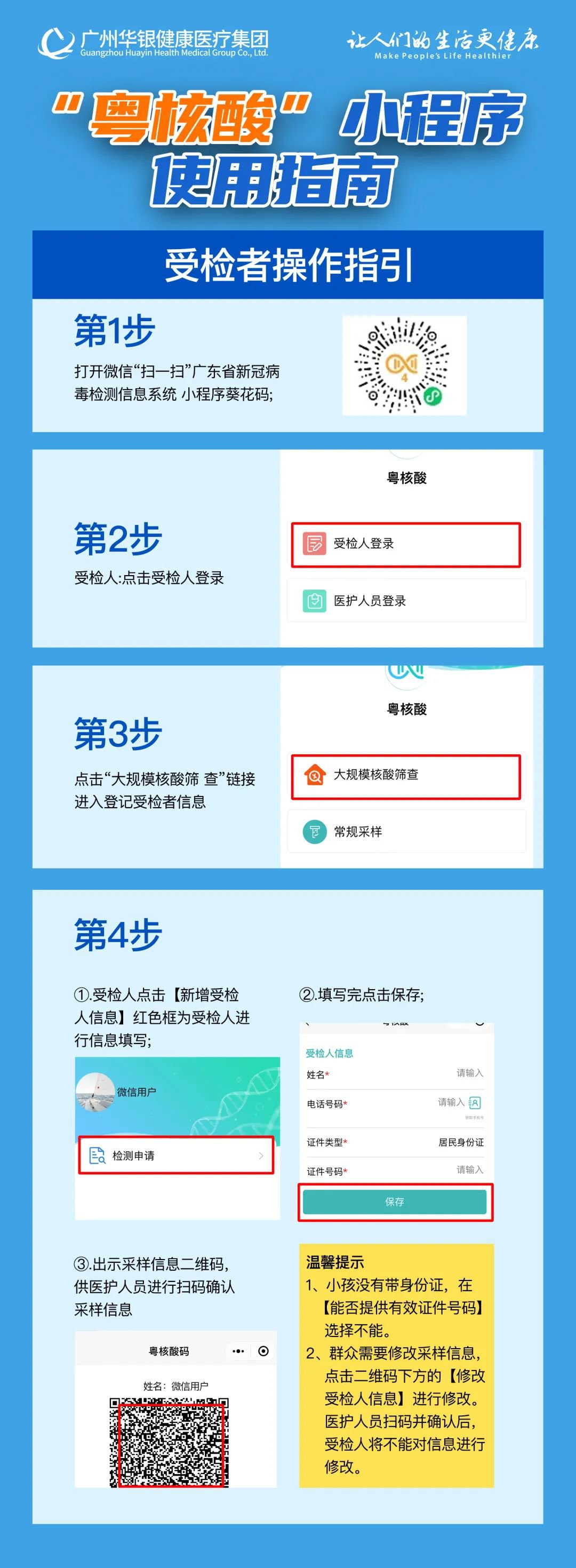 1、采样时请携带身份证原件、手机,主动出示“粤康码”“行程码”,配合工作人员做好信息登记和样本采集工作,并全程科学佩戴口罩,与他人保持1米以上间隔,不交谈、不聚集。无正当理由拒不配合、妨碍疫情防控或造成其他严重后果的,须依法承担相应法律责任。
