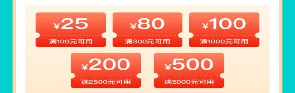 本次消费券为京东支付券,1张满100元减25元券、1张满300元减80元券、1张满1000减100元券、1张满2500元减200元券和1张满5000元减500元券。