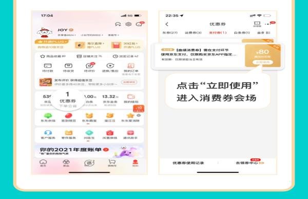 打开京东APP,登录已领取消费券的京东账户,可在“我的”—“优惠券”页面查看并使用已领取的消费券。