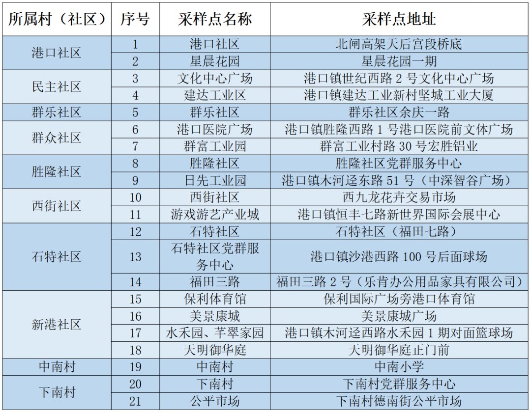 根据全市统一部署,港口镇将于2022年3月31日10:00-18:00(星期四)在全镇21个检测点开展区域性核酸检测。请广大市民群众务必高度重视,全力配合。为了您和家人的健康,请务必落实“应检尽检”,确保不漏一户,不落一人。请您按指引就近进行检测。现就全镇核酸检测工作有关安排通知如下: