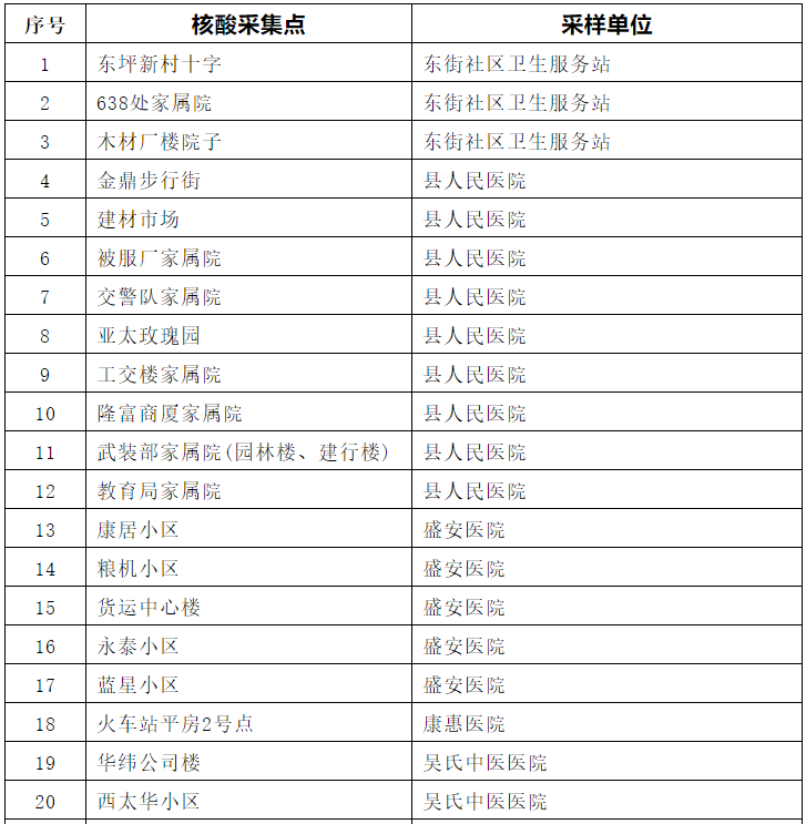 2、其他各乡镇具体采样地点以当地乡镇政府通知为准,请所有居民按照村委会工作人员的组织安排,主动到指定采样点参加采样。