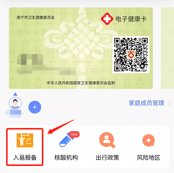 1、使用微信扫描下方“南宁市电子健康卡”二维码,打开小程序,点击“入邕报备”,跳转至“智慧防疫-健康南宁”小程序。