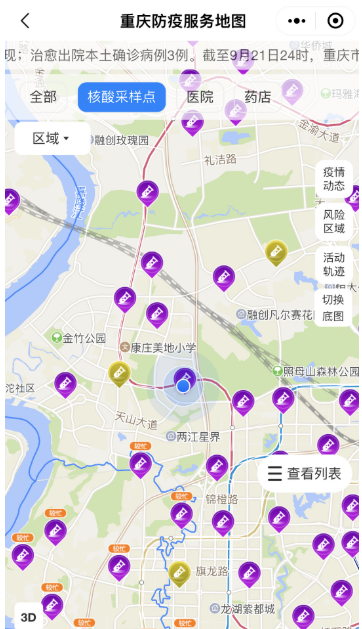 (三)点击“核酸采样点”,即可看到地图上标注的各个核酸采样点位置。(点击“查看列表”可查看点位名单)