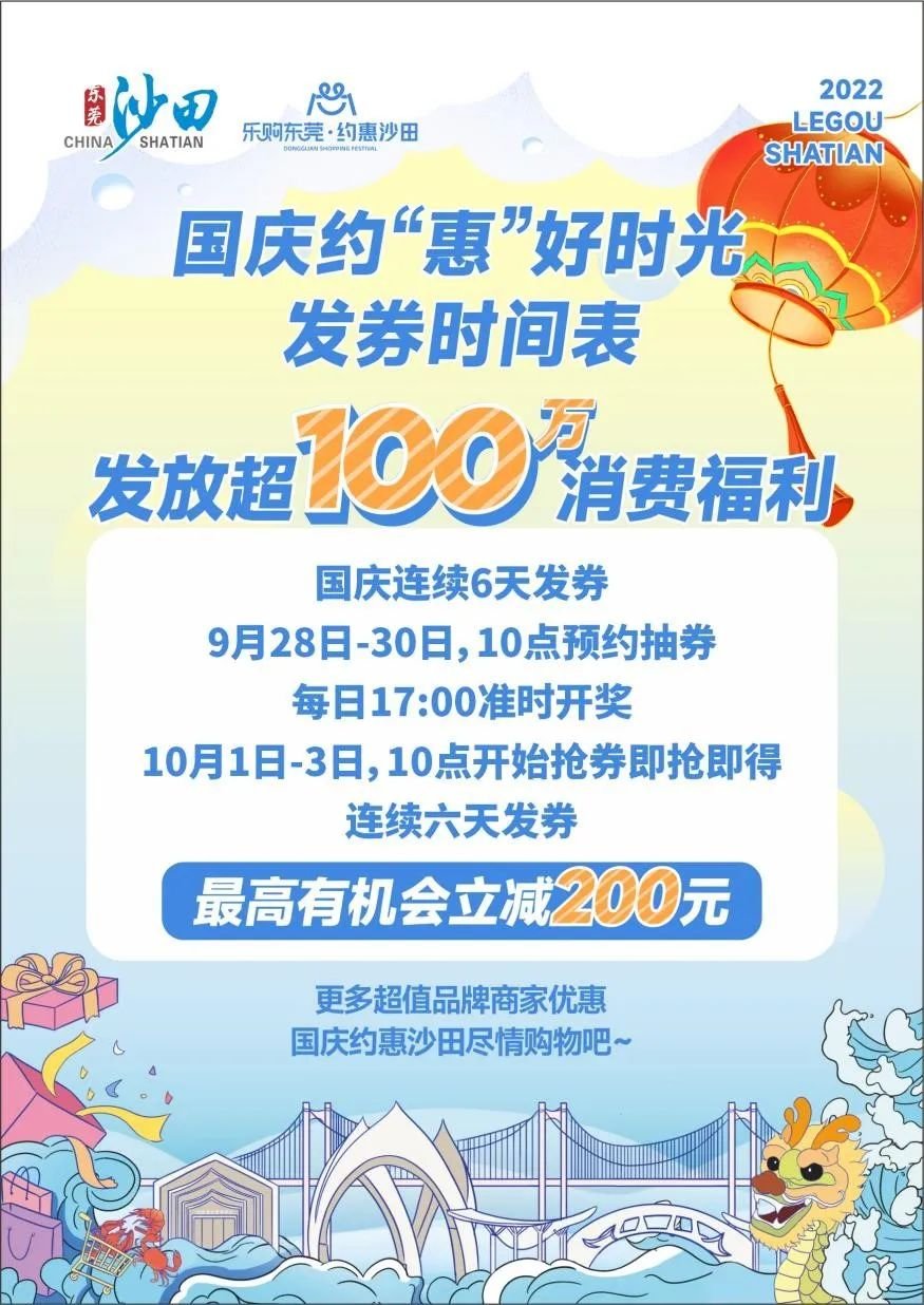 十一长假,沙田大波福利来袭,领券折上折,就是双倍快乐!约上亲朋,一起享受假期,乐购东莞•约惠沙田超100万消费补贴福利为您送上!