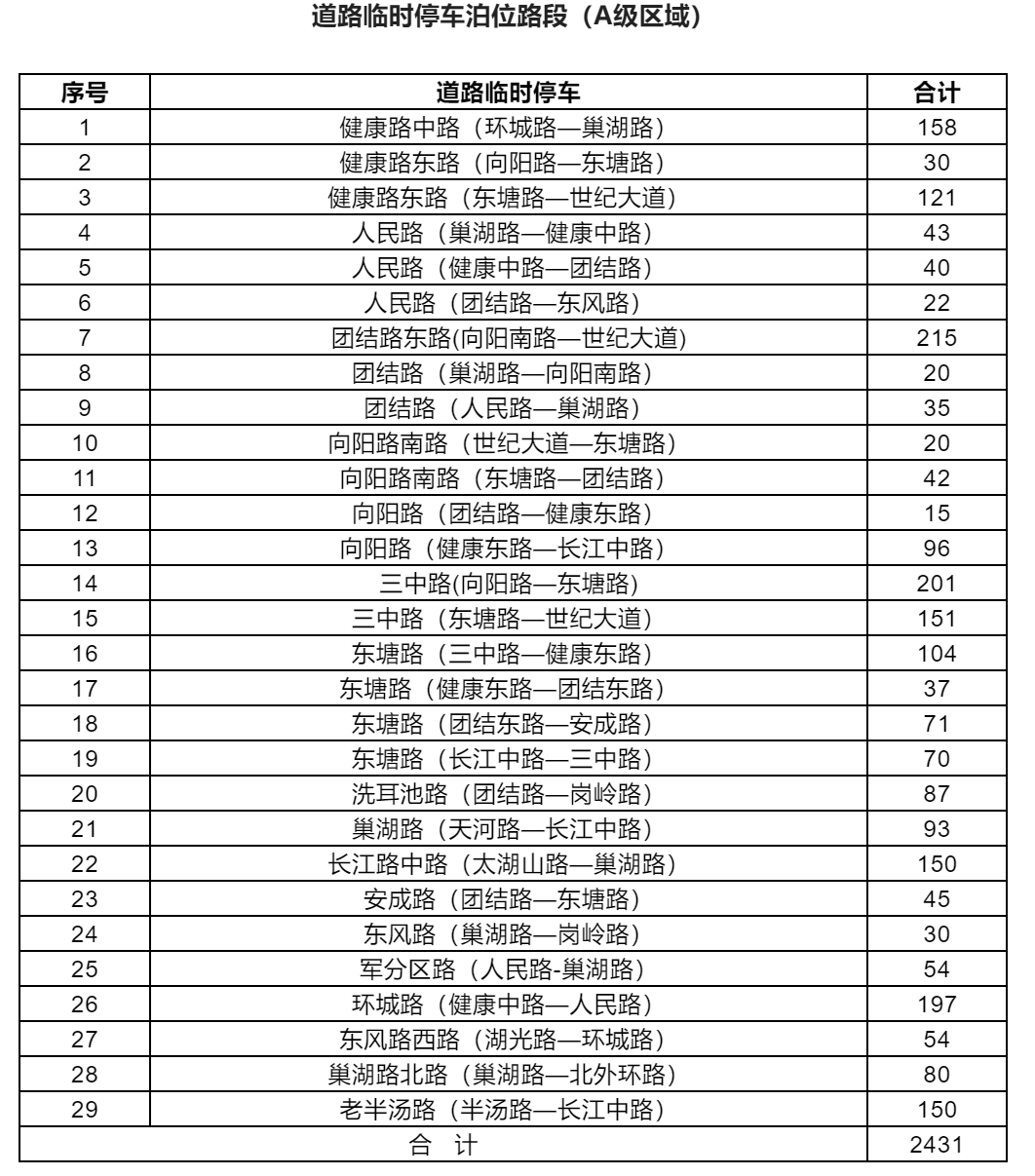 每逢重大节假日,巢湖城区停车泊位免费对市民开放已成常态化,其目的是确保巢湖市中心城区道路安全畅通,缓解节假日期间部分路段交通拥堵状况,减轻中心城区停车压力,方便群众出行。为此,今年国庆期间,巢湖市区A、B区域共4859个道路临时停车泊位仍全部免收停车费。其中A级区域29个路段,2431个泊位;B级区域37个路段,2428个泊位。主要分布在人民路、巢湖路、健康路、团结路、东风路、向阳路、东塘路等城区主干道。