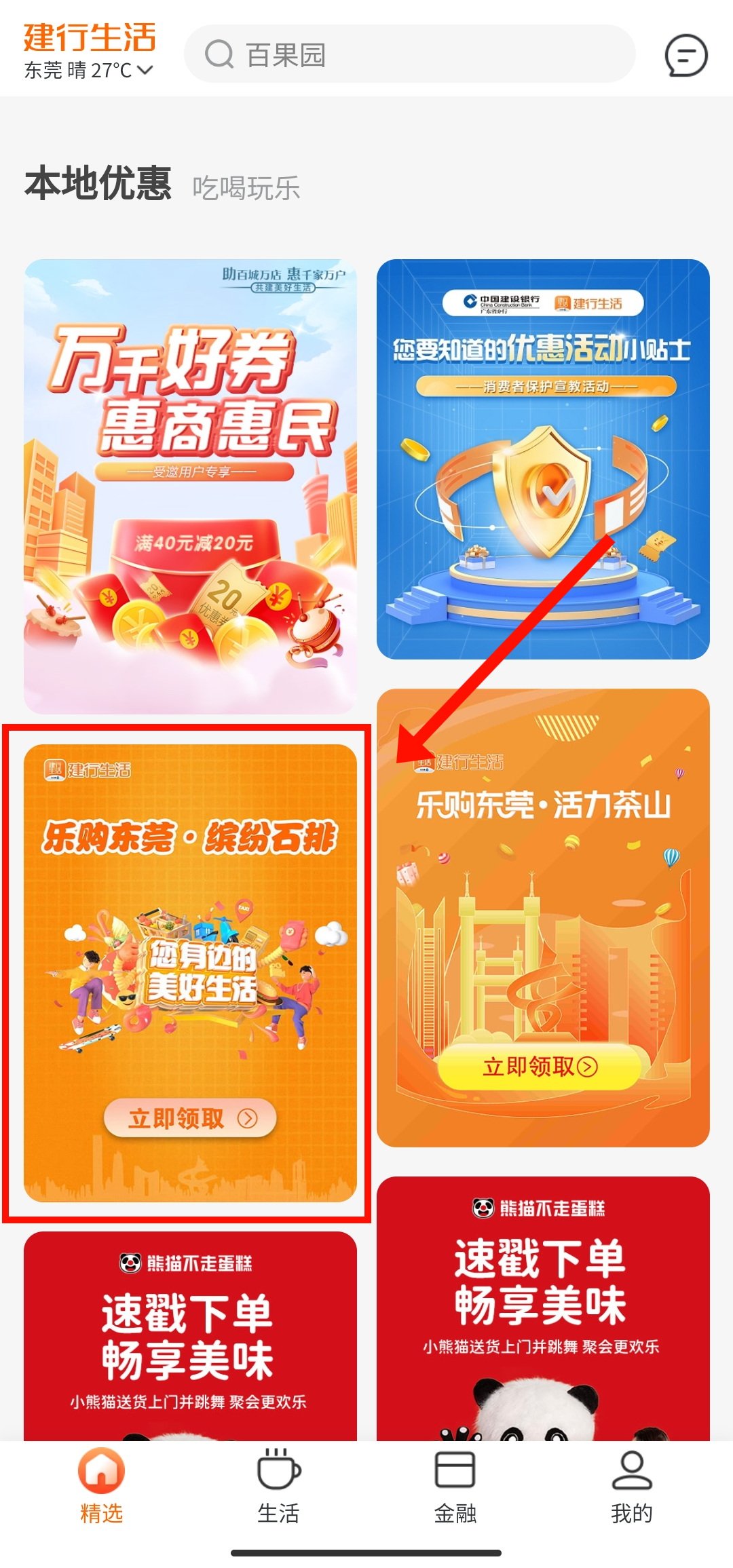 领券方式:下载“建行生活”APP,往下拉找到“本地优惠”,点击“乐购东莞 缤纷石排”,进入领券页面