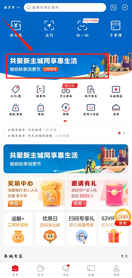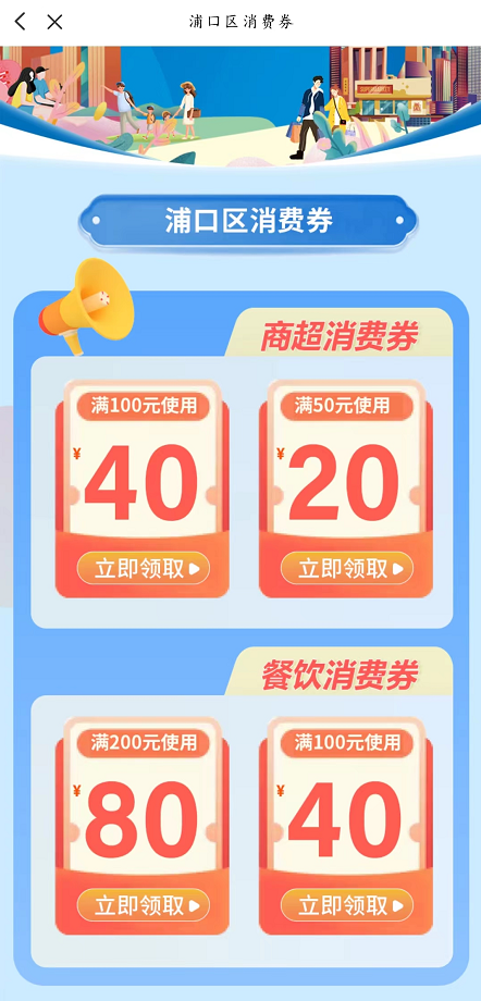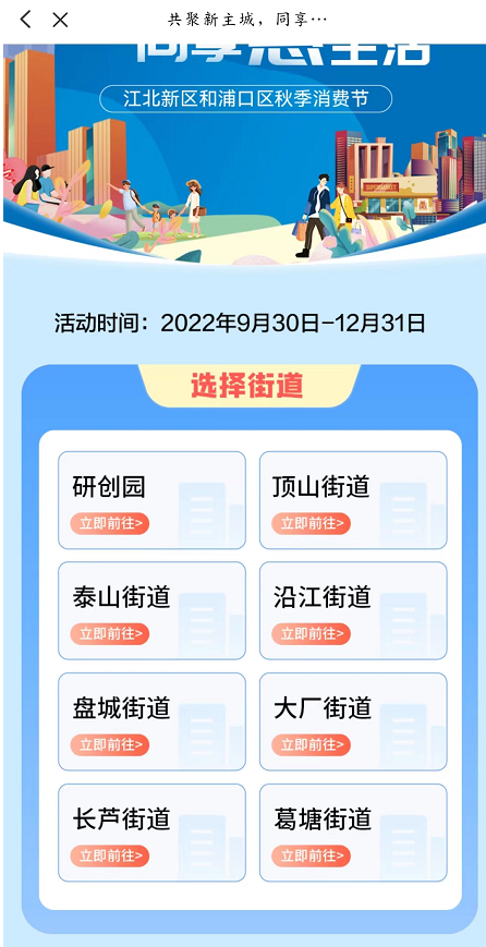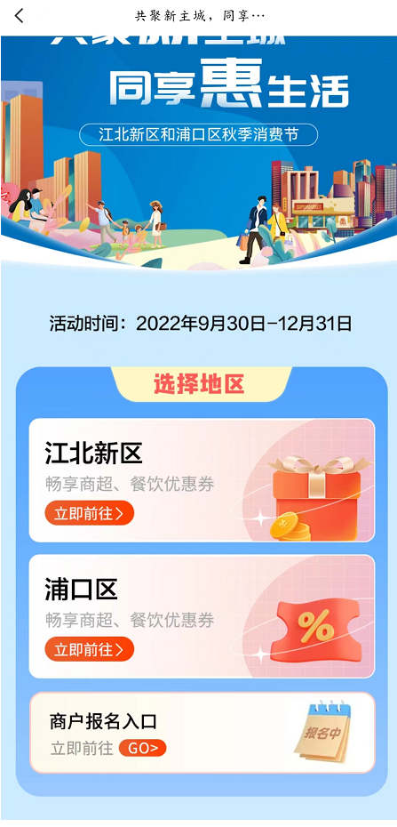 2022年9月30日20点整开始抢券(第一批),先到先得。领券后可在江北新区、浦口区范围内大型商业综合体、专业市场、购物中心、百货商场、超市、连锁便利店、商业街等商业载体内合作商户处消费,满额即减。