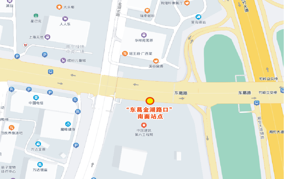 20路开往九曲湾温泉方向、45路开往方特东盟神画方向、52路开往埌东客运站方向、B17路开往南宁火车东站、B85路开往云景高坡岭方向,恢复“东葛金湖路口”南面站点停靠。