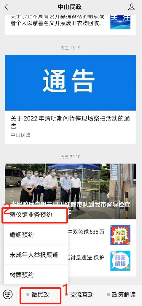 关注“中山民政”微信公众号进行预约