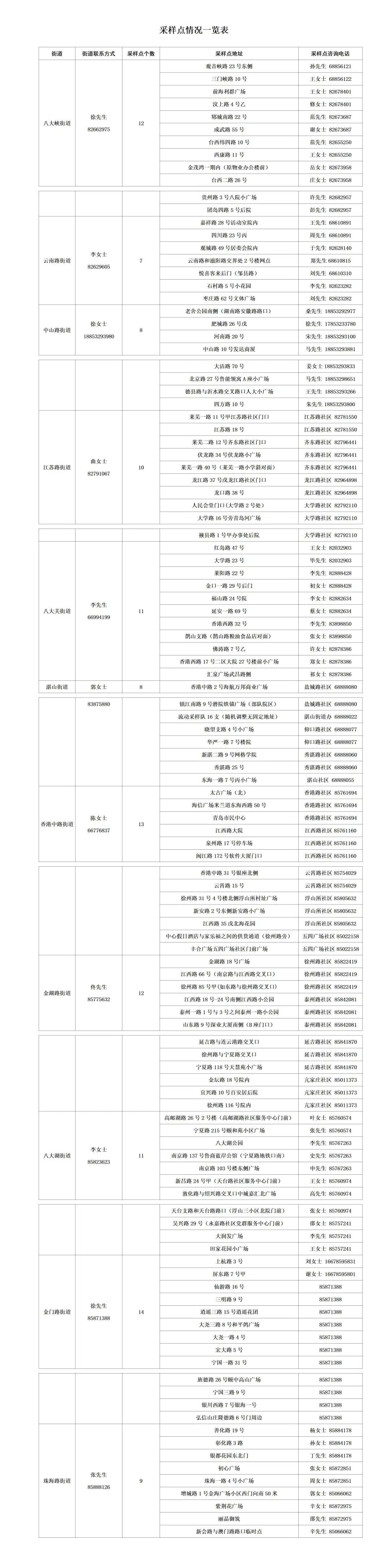 由各街道办事处统一安排采样点,具体信息详见采样点情况一览表(附后),或扫描“市南区核酸检测采样点地图小程序”(附后),对核酸检测采样点进行查询。