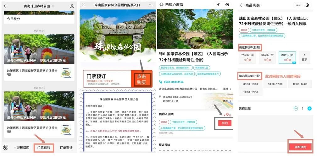 关注微信公众号“青岛珠山森林公园”或“西旅心度假”小程序以及美团、同程、携程等旅游网站。