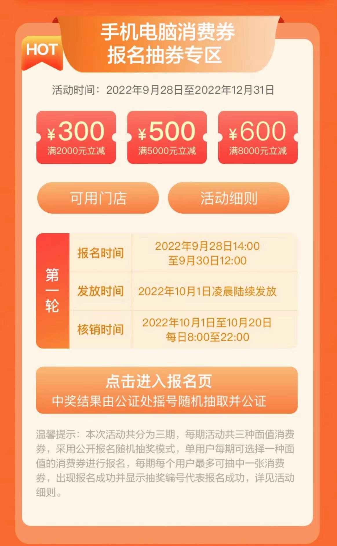 手机电脑(含平板电脑)消费券共3种面额,包括满2000元减300元券、满5000元减500元券、满8000元减600元券;获券消费者在适用门店购买手机(不含智能手表等具有通讯功能的可穿戴设备)、台式机电脑、笔记本电脑、一体机电脑、平板电脑(不含家教机、学习机类产品)时,使用云闪付APP支付,单件商品达到门槛金额即可享立减优惠。