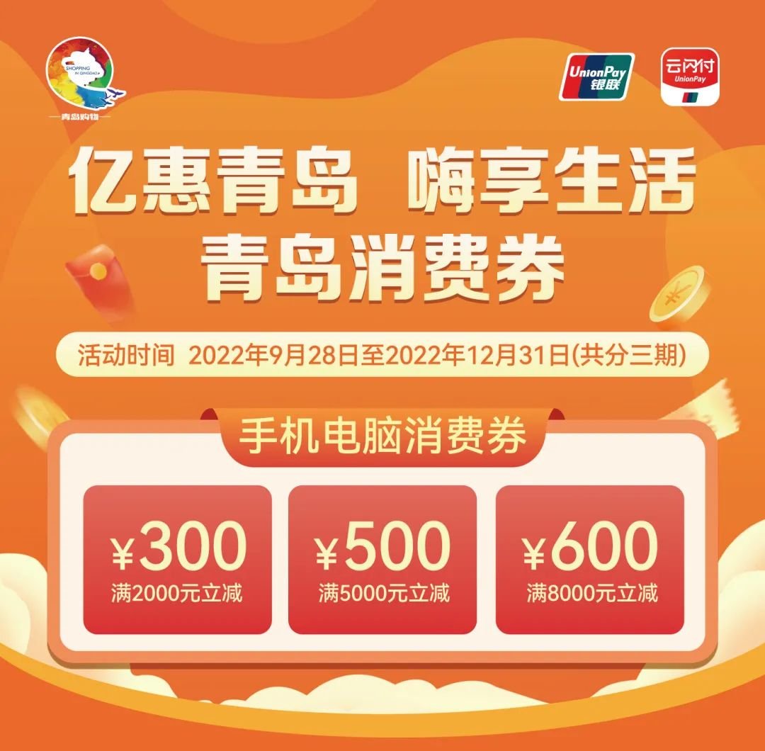 为让更多老百姓获得实惠,进一步促进消费市场繁荣,按照省、市促消费工作部署,将于2022年9月28日-12月31日期间,开展手机电脑(含平板电脑)消费券活动,通过云闪付APP“青岛消费券”活动专区向公众发放。这也是“2022青岛购物节·金秋生活节”的一个重要板块,目的是全力以赴激发青岛消费活力,放大消费券乘数效应,抢抓节庆消费黄金时机,全力满足消费需求、释放消费潜力。
