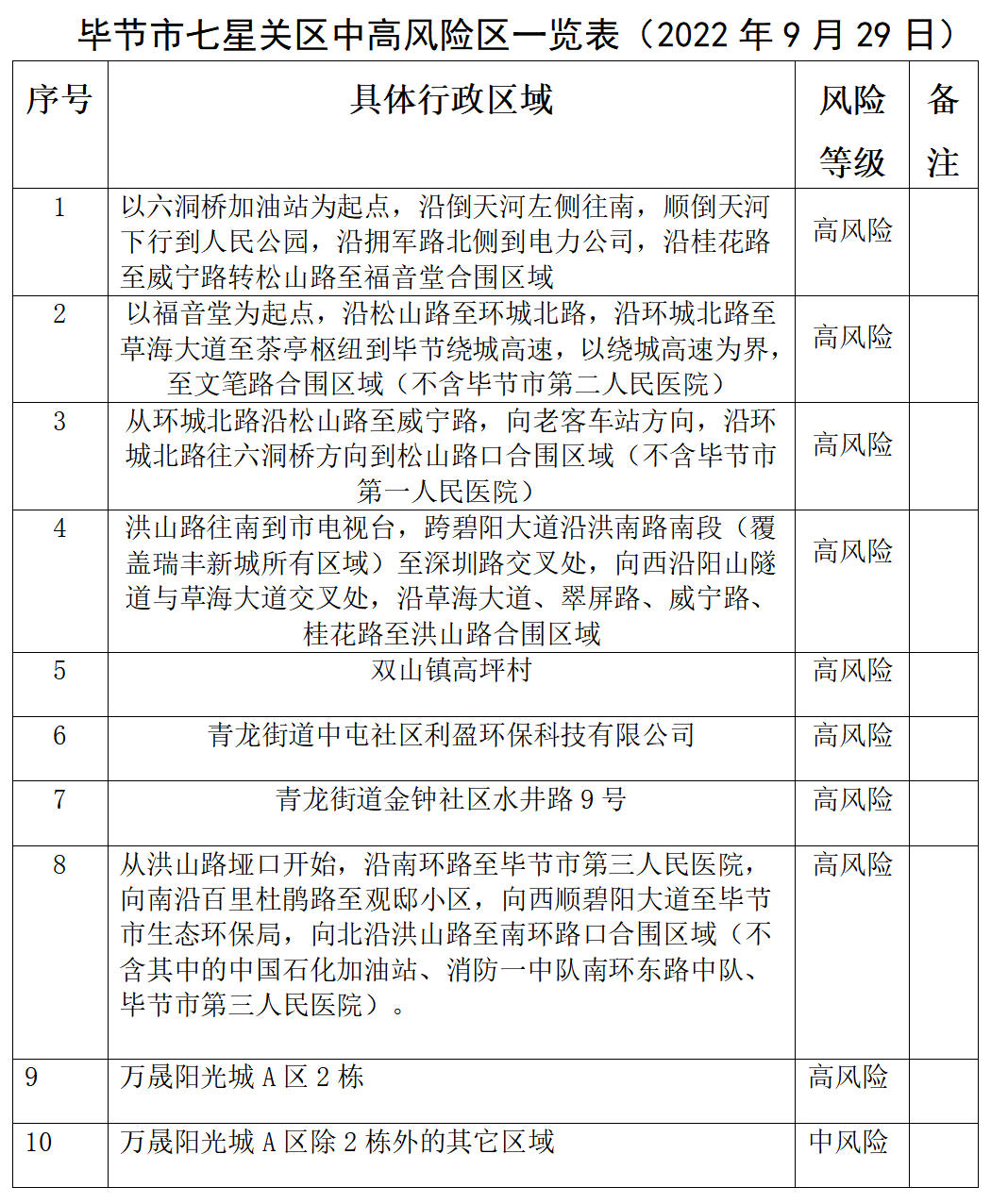 七星关区关于调整疫情防控中高风险区的公告(2022年9月29日16时起)