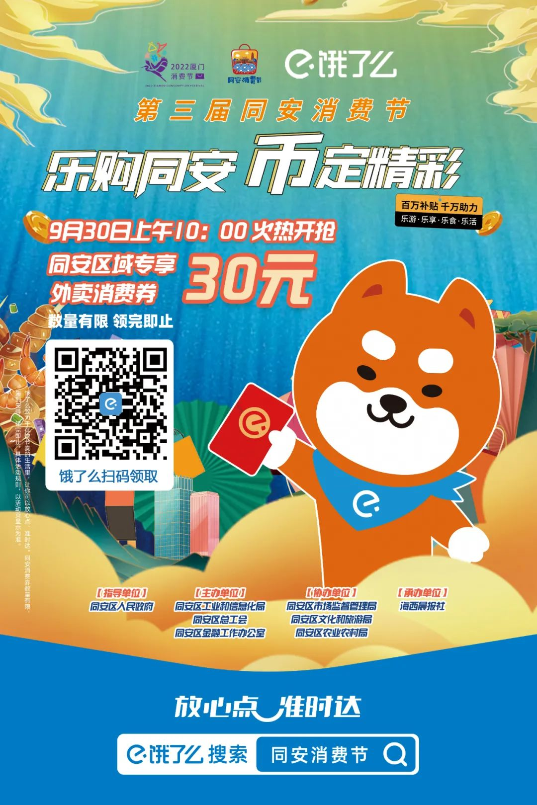 抢券须知:9月30日10:00开抢!优惠券是否抢券成功,以券包里显示的结果为准。使用范围限门店地址在厦门市同安区,已上线饿了么平台并参与此次活动的指定餐饮、商超、新零售门店,以活动页面展示为准。